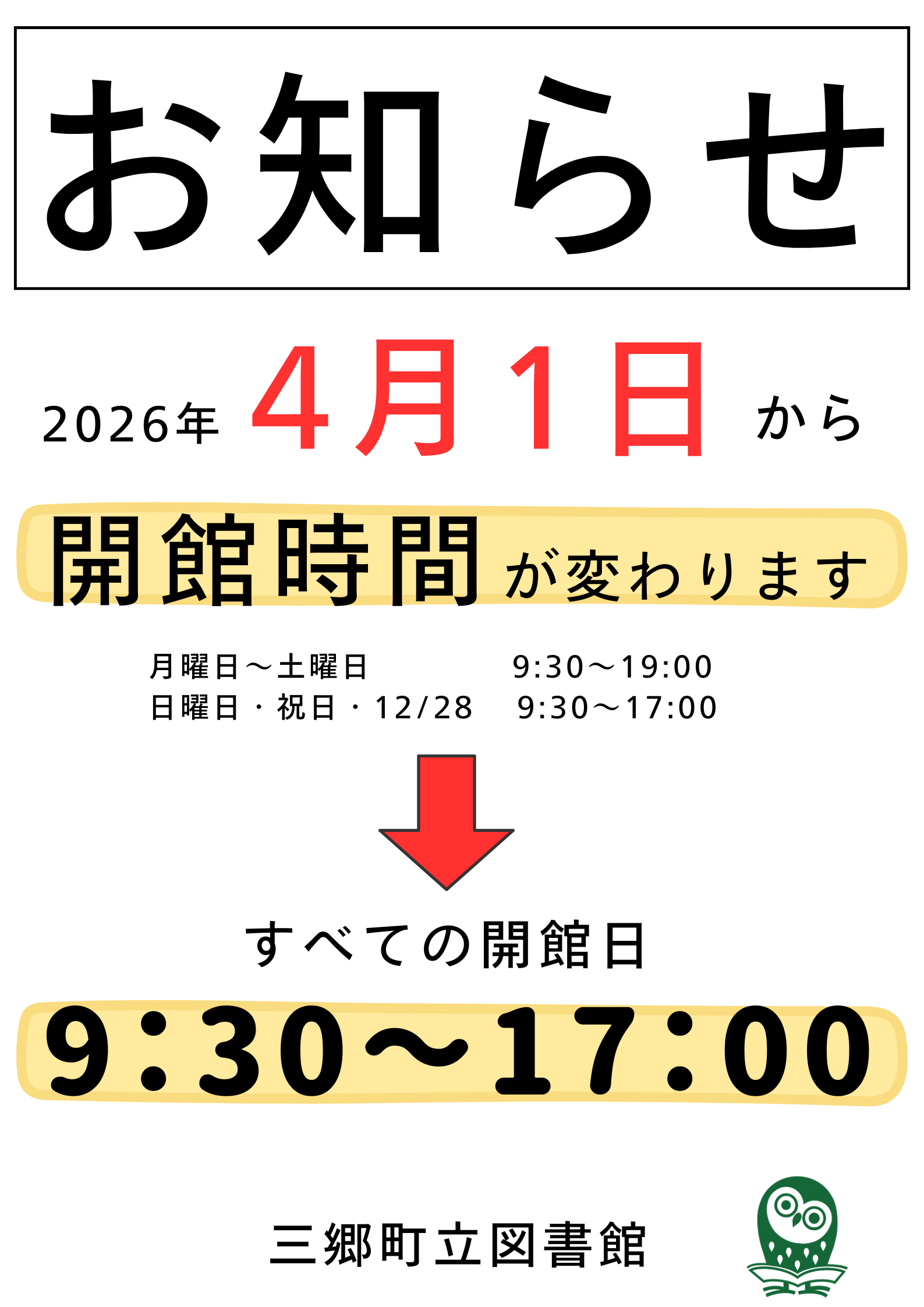 4月1日(水)から開館時間が変わります。