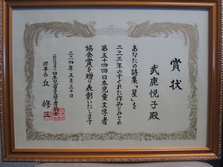 2014年、詩集「星」「星」(岩崎書店)により、第54回日本児童文学者協会賞(日本児童文学者協会主催)、第44回日本童謡賞(日本童謡協会主催)(3回目)を受賞。