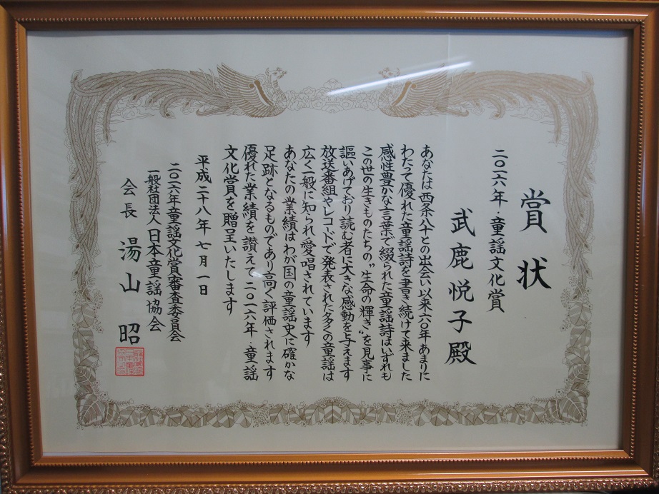 2016年、第15回童謡文化賞(日本童謡協会)を受賞。贈呈理由として日本童謡協会理事・甲賀一宏氏は「武鹿悦子氏の感性豊かな言葉によって綴られた「童謡詩」はいずれも、この世の生き物たちの『生命の輝き』を見事に謳いあげており、読む者に大きな感動を与える。武鹿悦子氏の「童謡詩」の特長は簡潔な音節数および優れて多彩な比喩表現、とりわけオノマトペの斬新さにある。氏の「童謡詩」はいずれもそれ自体が音楽豊かな『うた』の世界を奏でており、多くの作曲家を魅了し創作意欲を高めてきた。武鹿悦子氏の業績はわが国の童謡文化の歴史に確かな足跡となるものであり、極めて高く評価される」としています。