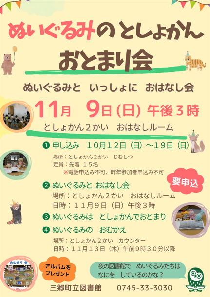 みなさんのぬいぐるみが、図書館でおとまりします。